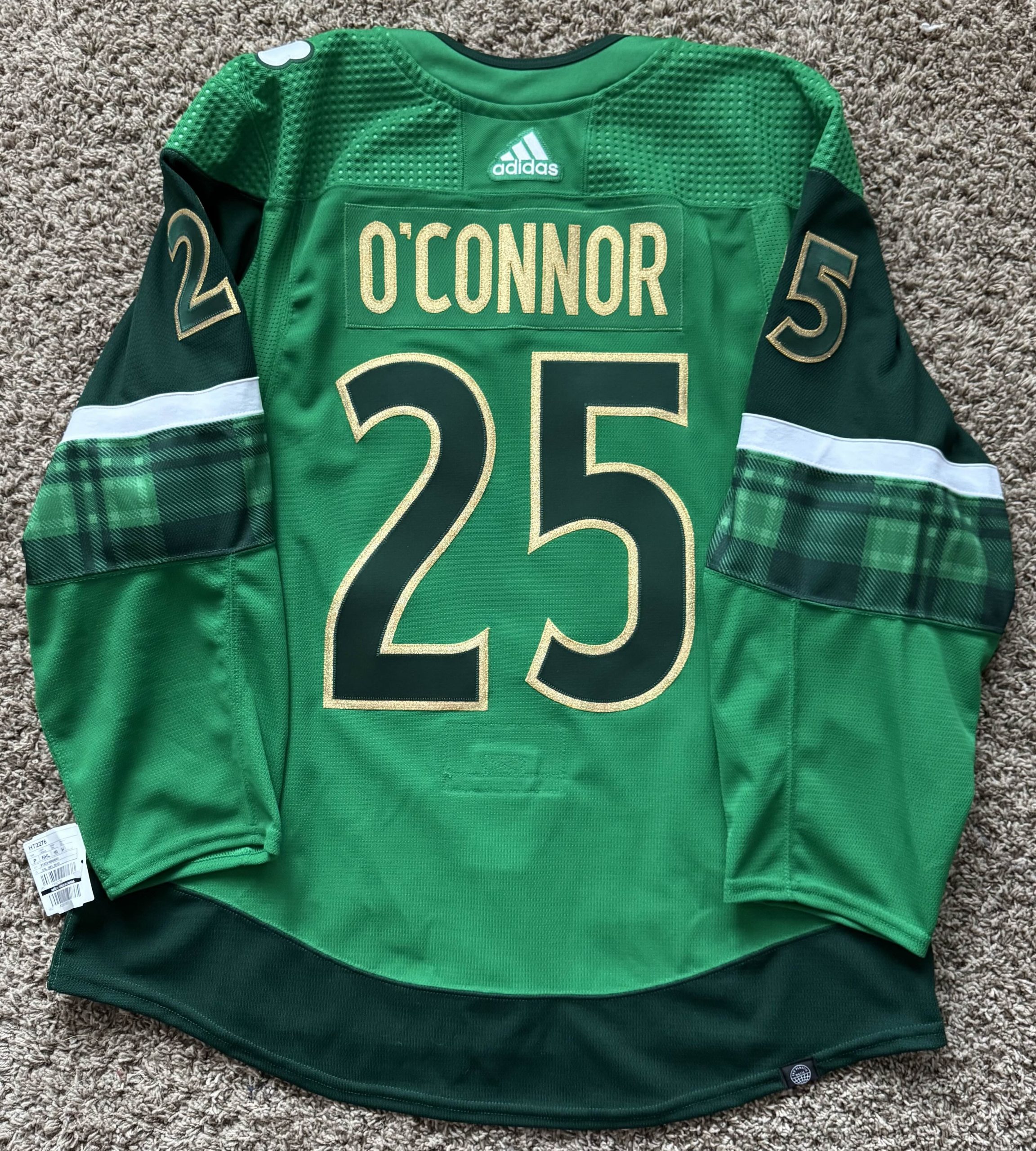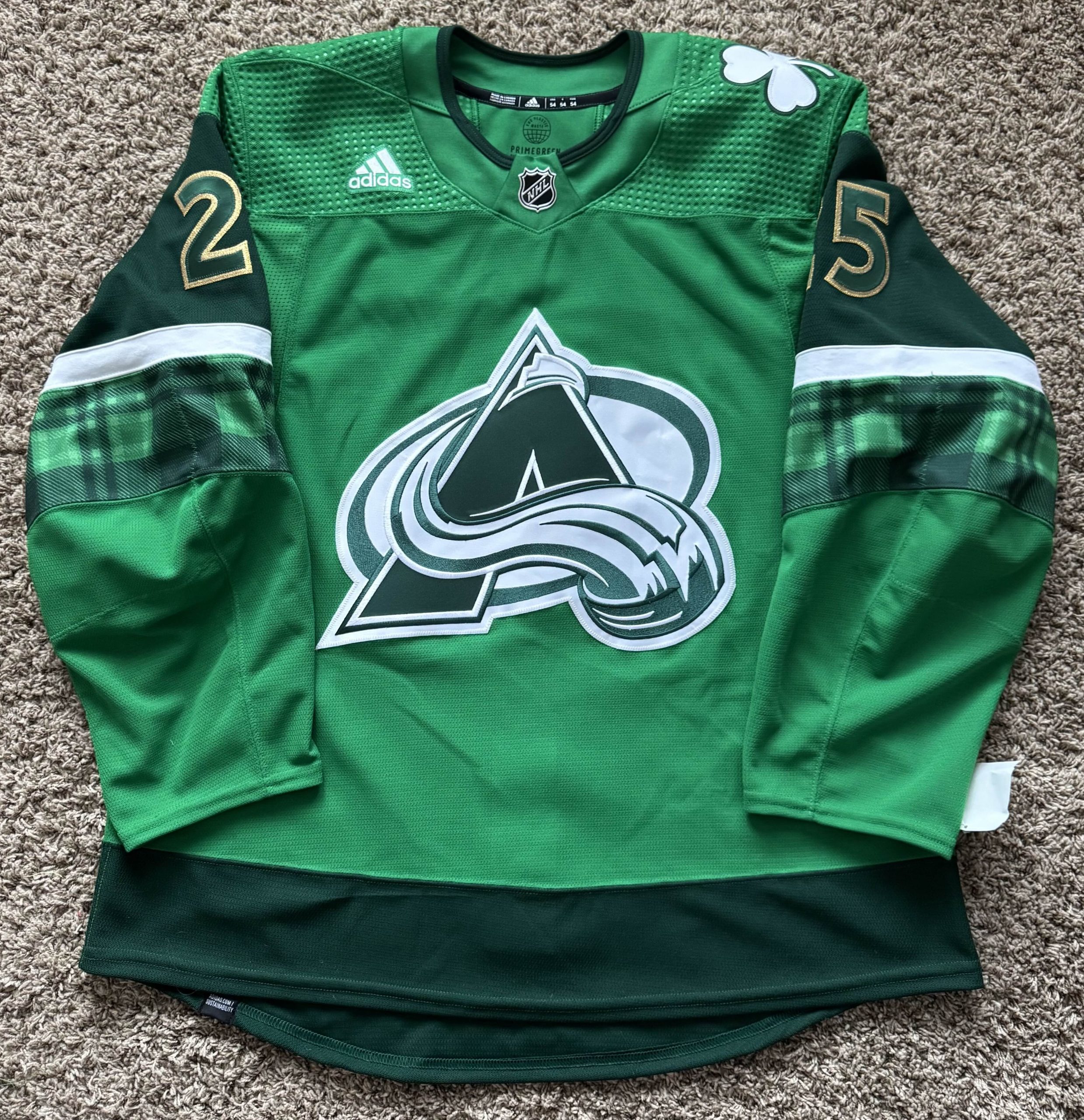 I browsed the kits available at Customize Sports and found one I liked, the Buffalo Sabres 2019 St. Patrick’s Day Jerseys. But it’s me, and since I had free rein, I wanted to make some tweaks to it. I placed an order with CS and asked if we could use the Avs font for the name and numbers, and delete the shamrocks at the bottom of the numbers. A couple of days later, I received a proof from CS and quickly gave them the AOK.